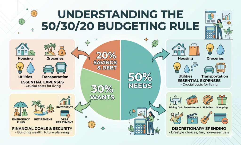 यह बजटिंग का एक सरल नियम है। इसमें आपकी आय का 50% बुनियादी ज़रूरतों (Needs) पर, 30% आपकी इच्छाओं (Wants) पर, और बाकी बचा 20% अनिवार्य रूप से बचत और निवेश (Savings/Investment) में जाना चाहिए।