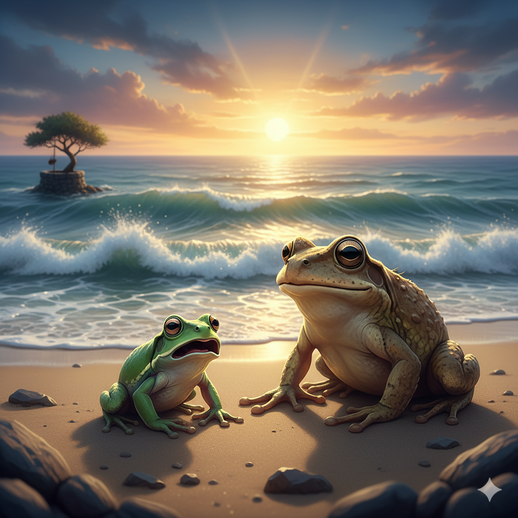 एक समय की बात है, एक पुराने कुएँ में एक मेंढक रहता था। उसका नाम ‘कूपक’ था। कूपक ने कभी भी कुएँ से बाहर की दुनिया नहीं देखी थी। वह मानता था कि उसका कुआँ ही पूरी दुनिया है, और उससे बड़ा कुछ नहीं। वह अपने छोटे से कुएँ में कूदता, उछलता और स्वयं को सबसे महान समझता था।एक दिन, एक समुद्री मेंढक, जिसका नाम ‘जलधि’ था, भटकते हुए उस कुएँ के पास आ पहुँचा। वह प्यास बुझाने के लिए कुएँ में कूदा।कूपक ने जलधि को देखा और हैरानी से पूछा, “तुम कहाँ से आए हो? क्या तुम इस कुएँ से हो? मैंने तुम्हें पहले कभी नहीं देखा।”जलधि ने जवाब दिया, “नहीं, मैं यहाँ से नहीं हूँ। मैं तो बहुत दूर, विशाल समुद्र से आया हूँ।”कूपक हँसा, “समुद्र? यह क्या होता है? क्या यह मेरे इस कुएँ जितना बड़ा है?”जलधि ने मुस्कुराते हुए कहा, “तुम्हारे कुएँ से हज़ार गुना नहीं, बल्कि लाखों-करोड़ों गुना बड़ा है समुद्र। यह इतना विशाल है कि तुम इसकी कल्पना भी नहीं कर सकते। इसमें अनगिनत जीव रहते हैं, और इसका कोई किनारा नहीं दिखता।”कूपक को यह बात मज़ाक लगी। उसने कहा, “तुम झूठ बोल रहे हो! इस छोटे से कुएँ से बड़ा कुछ नहीं हो सकता। तुम मुझे बेवकूफ बनाने की कोशिश कर रहे हो।”जलधि ने उसे समझाने की बहुत कोशिश की, लेकिन कूपक अपनी बात पर अड़ा रहा। वह अपने सीमित दायरे को ही पूरी दुनिया मानता था और किसी भी नई बात को स्वीकार करने को तैयार नहीं था।हार मानकर, जलधि ने कूपक से कहा, “ठीक है, अगर तुम्हें विश्वास नहीं होता, तो मेरे साथ आओ। मैं तुम्हें समुद्र दिखाऊँगा।”शुरुआत में कूपक डर गया, लेकिन जलधि के लगातार आग्रह पर, उसने हिम्मत की और कुएँ से बाहर निकला। पहली बार उसने आसमान देखा, हरे-भरे पेड़ देखे, और एक खुली, विशाल दुनिया देखी। वह हैरान रह गया।फिर जलधि उसे समुद्र तट पर ले गया। जैसे ही कूपक ने विशाल, नीले समुद्र को देखा, उसकी आँखें खुली की खुली रह गईं। उसे विश्वास नहीं हो रहा था कि ऐसी जगह भी हो सकती है। वह तुरंत समझ गया कि उसकी दुनिया कितनी छोटी थी और उसने कितने बड़े भ्रम में जीवन बिताया था।